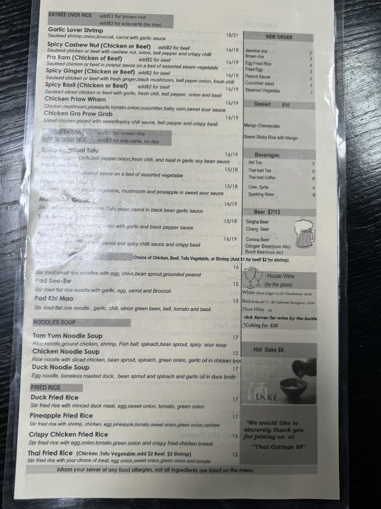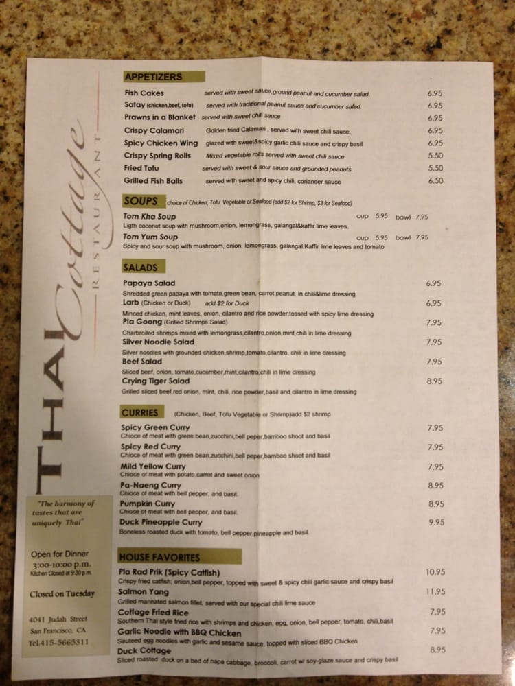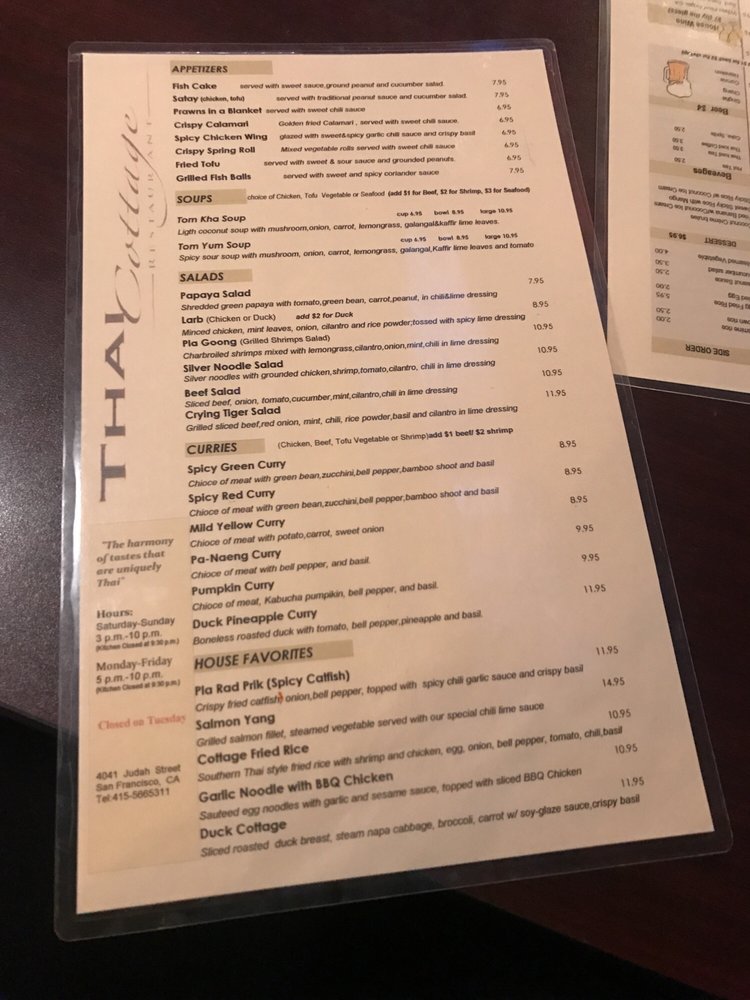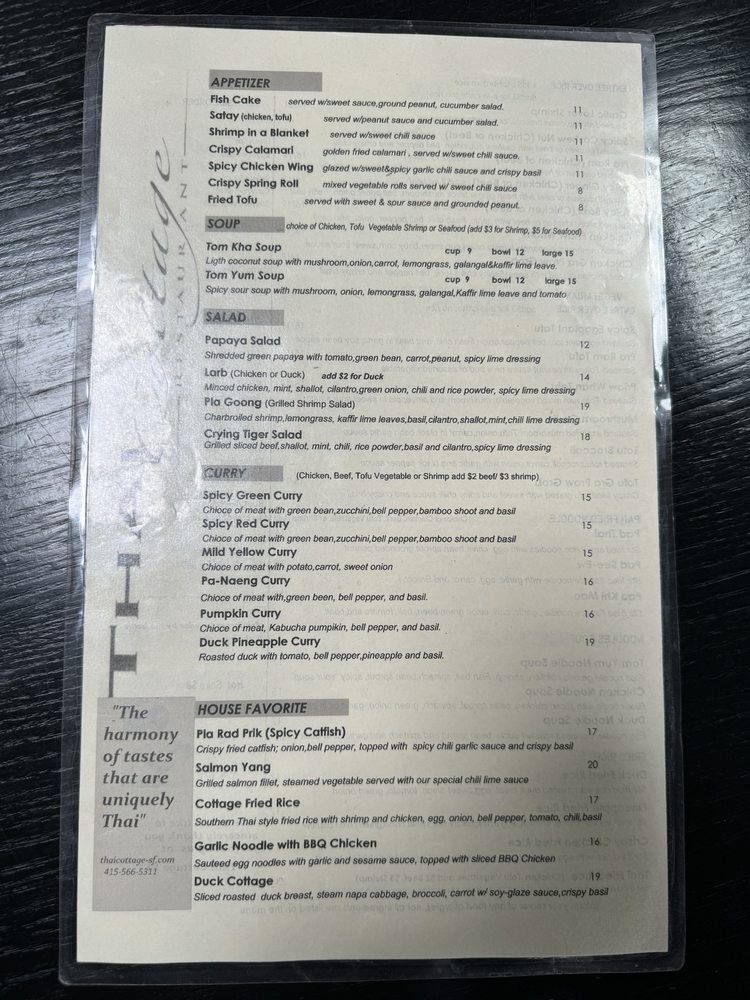 Welcome to Thai Cottage, a charming sanctuary for Thai cuisine nestled at 4041 Judah St, San Francisco. This casual eatery excels in creating an inviting atmosphere, perfect for family gatherings or a relaxing dinner with friends. The menu is a delightful exploration of vibrant flavors, featuring standout dishes like Tom Yum Noodle Soup and expertly crafted curries that transport you straight to Thailand.